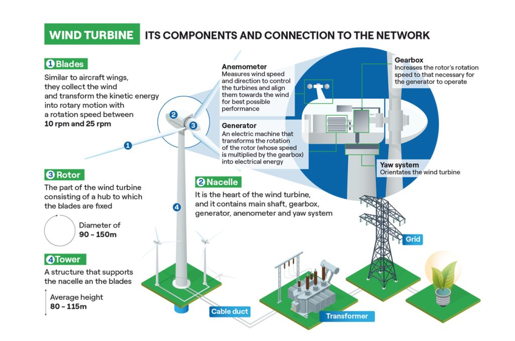 پرههای توربین، که مانند پروانههای هواپیما یا هلیکوپتر هستند، از نیروی آیرودینامیکی باد برای چرخاندن روتور استفاده میکنند که یک ژنراتور را میچرخاند. این فرآیند برق تولید میکند که معمولاً به شبکه برق تزریق میشود.