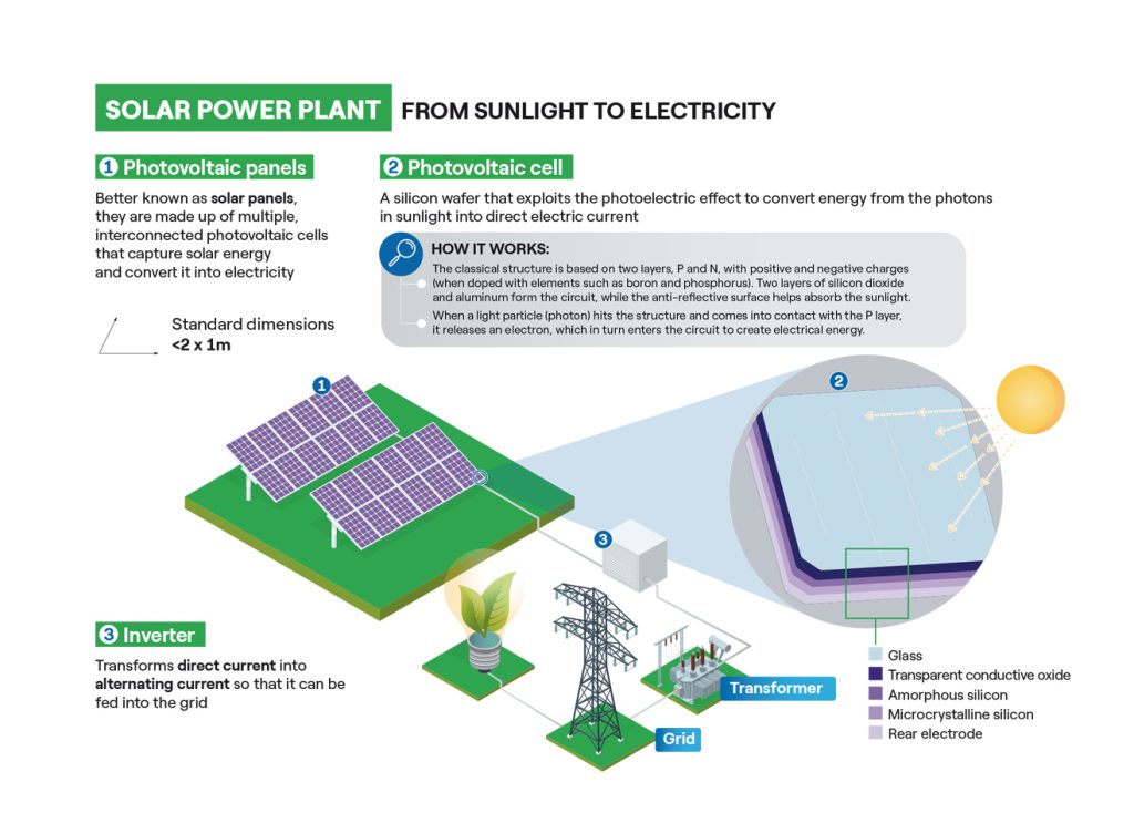 هسته هر پارک خورشیدی فتوولتائیک توسط پنلهای خورشیدی نشان داده میشود. پوشش نیمهرسانای آنها – به عنوان مثال سیلیس – به نور مرئی واکنش نشان میدهد و هنگام برخورد با تابش خورشیدی، به لطف پدیده فیزیکی معروف به “اثر فتوولتائیک”، انرژی تولید میکند. سپس پنلها بر روی پایههای نگهدارنده نصب میشوند که تضمین میکند آنها به درستی شیب و جهتگیری شدهاند تا بتوانند از قرار گرفتن در معرض نور به طور کامل بهرهبرداری کنند.