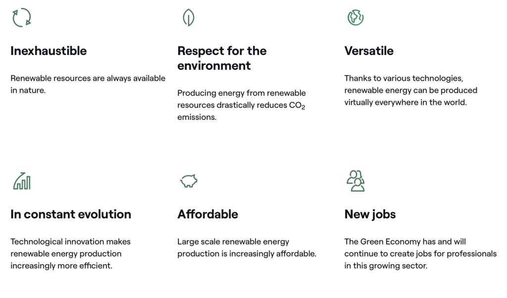 آنها مهمترین بخش گذار به یک سیستم انرژی هستند که از سوختهای فسیلی فاصله میگیرد و در نتیجه با گرمایش جهانی مقابله میکند. و آنها انرژیهای پاکی هستند که از سلامت انسان و محیط زیست محافظت میکنند.